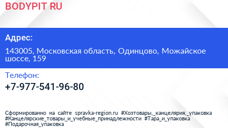 BODYPIT.RU по адресу 143005, Московская область, Одинцово, Можайское шоссе, 159 в дальнейшем Организация, размещена в следующих категориях: