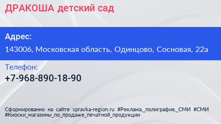 ДРАКОША, детский сад по адресу 143006, Московская область, Одинцово, Сосновая, 22а в дальнейшем Организация, размещена в следующих категориях: