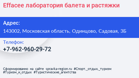 Effacee, лаборатория балета и растяжки по адресу 143002, Московская область, Одинцово, Садовая, 3Б в дальнейшем Организация, размещена в следующих категориях: