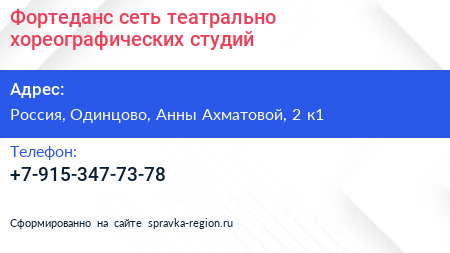 Фортеданс, сеть театрально-хореографических студий по адресу Гимназия №1788. Дошкольное отделение №3, улица Анны Ахматовой, ЖК «Переделкино Ближнее», район Внуково, Москва, Центральный федеральный округ, 119634, Россия в дальнейшем Организация, размещена в следующих категориях: