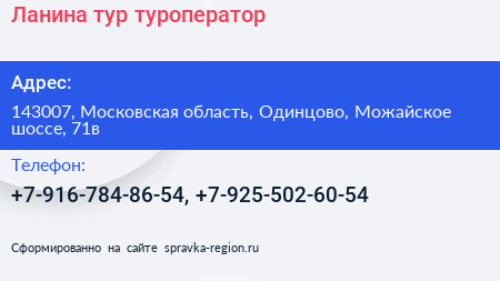 Ланина-тур, туроператор по адресу 143007, Московская область, Одинцово, Можайское шоссе, 71в в дальнейшем Организация, размещена в следующих категориях: