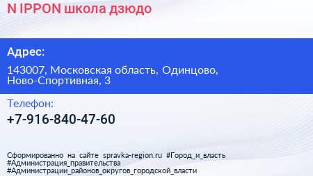 N IPPON, школа дзюдо по адресу 143007, Московская область, Одинцово, Ново-Спортивная, 3 в дальнейшем Организация, размещена в следующих категориях: