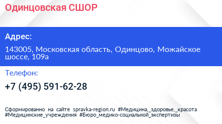 Одинцовская СШОР по адресу 143005, Московская область, Одинцово, Можайское шоссе, 109а в дальнейшем Организация, размещена в следующих категориях: