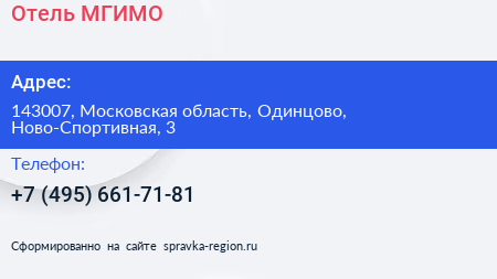 Отель, МГИМО по адресу 143007, Московская область, Одинцово, Ново-Спортивная, 3 в дальнейшем Организация, размещена в следующих категориях: