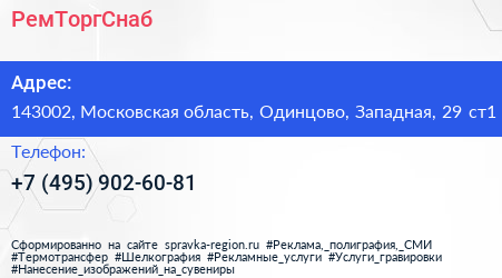 РемТоргСнаб по адресу 143002, Московская область, Одинцово, Западная, 29 ст1 в дальнейшем Организация, размещена в следующих категориях: