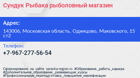 Сундук Рыбака, рыболовный магазин по адресу 143006, Московская область, Одинцово, Маковского, 15 ст2 в дальнейшем Организация, размещена в следующих категориях: