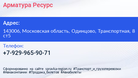 Арматура-Ресурс по адресу 143006, Московская область, Одинцово, Транспортная, 8 ст5 в дальнейшем Организация, размещена в следующих категориях:
