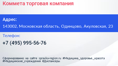 Коммета, торговая компания по адресу 143002, Московская область, Одинцово, Акуловская, 23 в дальнейшем Организация, размещена в следующих категориях: