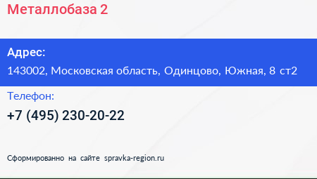 Металлобаза №2 по адресу 143002, Московская область, Одинцово, Южная, 8 ст2 в дальнейшем Организация, размещена в следующих категориях: