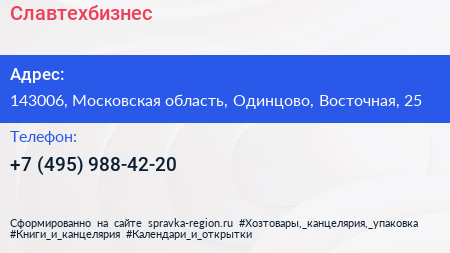 Славтехбизнес по адресу 143006, Московская область, Одинцово, Восточная, 25 в дальнейшем Организация, размещена в следующих категориях: