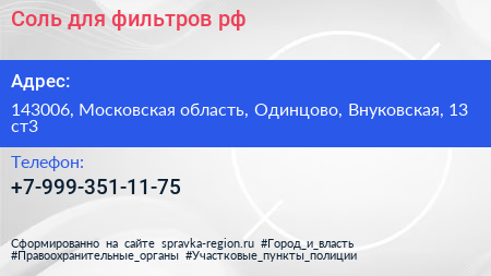 Соль для фильтров.рф по адресу 143006, Московская область, Одинцово, Внуковская, 13 ст3 в дальнейшем Организация, размещена в следующих категориях: