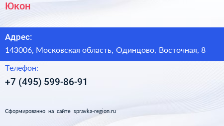 Юкон по адресу 143006, Московская область, Одинцово, Восточная, 8 в дальнейшем Организация, размещена в следующих категориях:
