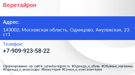 Веретайрон по адресу 143002, Московская область, Одинцово, Акуловская, 23 ст1 в дальнейшем Организация, размещена в следующих категориях: