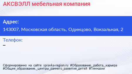 АКСВЭЛЛ, мебельная компания по адресу 143007, Московская область, Одинцово, Вокзальная, 2 в дальнейшем Организация, размещена в следующих категориях: