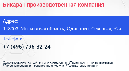 Бикаран, производственная компания по адресу 143003, Московская область, Одинцово, Северная, 62а в дальнейшем Организация, размещена в следующих категориях: