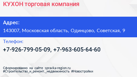 КУХОН, торговая компания по адресу 143007, Московская область, Одинцово, Советская, 9 в дальнейшем Организация, размещена в следующих категориях: