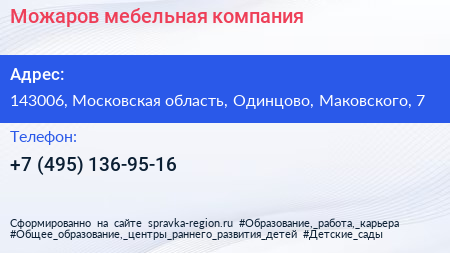 Можаров, мебельная компания по адресу 143006, Московская область, Одинцово, Маковского, 7 в дальнейшем Организация, размещена в следующих категориях: