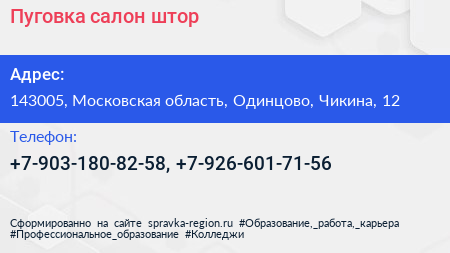 Пуговка, салон штор по адресу 143005, Московская область, Одинцово, Чикина, 12 в дальнейшем Организация, размещена в следующих категориях: