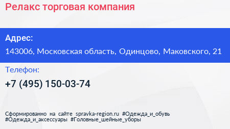 Релакс, торговая компания по адресу 143006, Московская область, Одинцово, Маковского, 21 в дальнейшем Организация, размещена в следующих категориях: