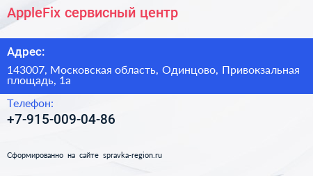 AppleFix, сервисный центр по адресу 143007, Московская область, Одинцово, Привокзальная площадь, 1а в дальнейшем Организация, размещена в следующих категориях: