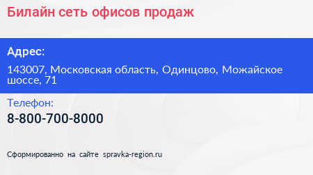 Билайн, сеть офисов продаж по адресу 143007, Московская область, Одинцово, Можайское шоссе, 71 в дальнейшем Организация, размещена в следующих категориях: