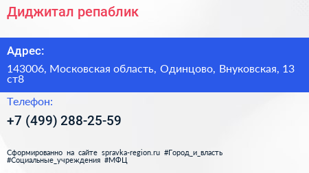 Диджитал репаблик по адресу 143006, Московская область, Одинцово, Внуковская, 13 ст8 в дальнейшем Организация, размещена в следующих категориях: