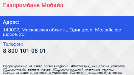 Газпромбанк Мобайл по адресу 143007, Московская область, Одинцово, Можайское шоссе, 20 в дальнейшем Организация, размещена в следующих категориях: