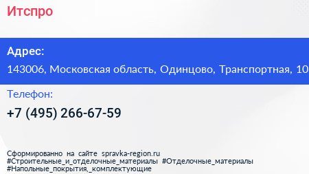 Итспро по адресу 143006, Московская область, Одинцово, Транспортная, 10 в дальнейшем Организация, размещена в следующих категориях: