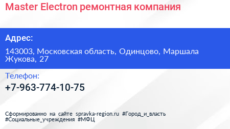 Master-Electron, ремонтная компания по адресу 143003, Московская область, Одинцово, Маршала Жукова, 27 в дальнейшем Организация, размещена в следующих категориях: