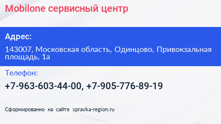 Mobilone, сервисный центр по адресу 143007, Московская область, Одинцово, Привокзальная площадь, 1а в дальнейшем Организация, размещена в следующих категориях: