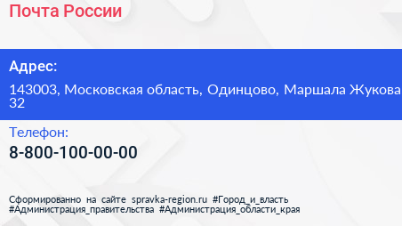 Почта России по адресу 143003, Московская область, Одинцово, Маршала Жукова, 32 в дальнейшем Организация, размещена в следующих категориях: