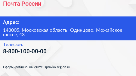 Почта России по адресу 143005, Московская область, Одинцово, Можайское шоссе, 43 в дальнейшем Организация, размещена в следующих категориях: