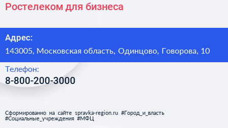 Ростелеком для бизнеса по адресу 143005, Московская область, Одинцово, Говорова, 10 в дальнейшем Организация, размещена в следующих категориях:
