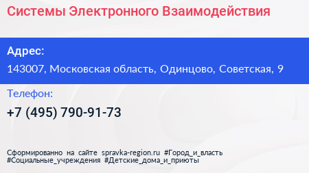 Системы Электронного Взаимодействия по адресу 143007, Московская область, Одинцово, Советская, 9 в дальнейшем Организация, размещена в следующих категориях: