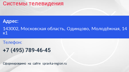 Системы телевидения по адресу 143002, Московская область, Одинцово, Молодёжная, 14 к1 в дальнейшем Организация, размещена в следующих категориях: