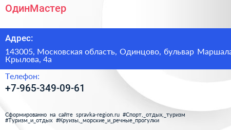 ОдинМастер по адресу 143005, Московская область, Одинцово, бульвар Маршала Крылова, 4а в дальнейшем Организация, размещена в следующих категориях: