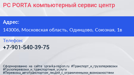 PC-PORTA, компьютерный сервис-центр по адресу 143006, Московская область, Одинцово, Союзная, 1в в дальнейшем Организация, размещена в следующих категориях: