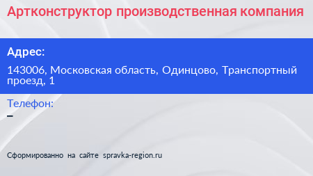 Артконструктор, производственная компания по адресу 143006, Московская область, Одинцово, Транспортный проезд, 1 в дальнейшем Организация, размещена в следующих категориях:
