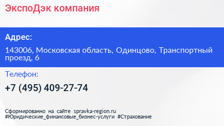 ЭкспоДэк, компания по адресу 143006, Московская область, Одинцово, Транспортный проезд, 6 в дальнейшем Организация, размещена в следующих категориях: