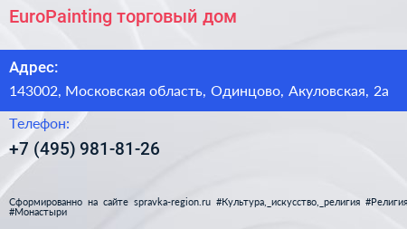 EuroPainting, торговый дом по адресу 143002, Московская область, Одинцово, Акуловская, 2а в дальнейшем Организация, размещена в следующих категориях: