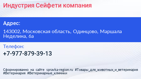 Индустрия Сейфети, компания по адресу 143002, Московская область, Одинцово, Маршала Неделина, 6а в дальнейшем Организация, размещена в следующих категориях: