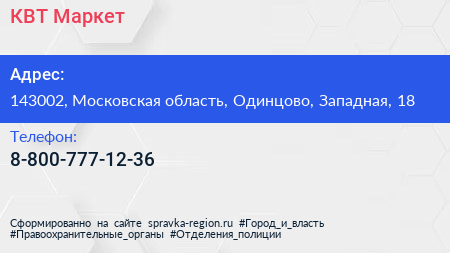 КВТ Маркет по адресу 143002, Московская область, Одинцово, Западная, 18 в дальнейшем Организация, размещена в следующих категориях: