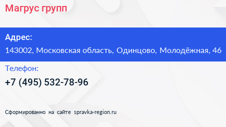 Магрус-групп по адресу 143002, Московская область, Одинцово, Молодёжная, 46 в дальнейшем Организация, размещена в следующих категориях: