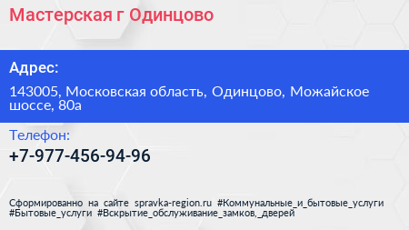 Мастерская, г. Одинцово по адресу 143005, Московская область, Одинцово, Можайское шоссе, 80а в дальнейшем Организация, размещена в следующих категориях: