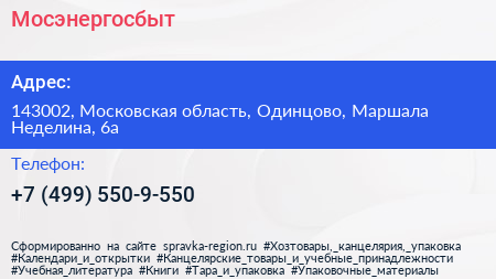 Мосэнергосбыт по адресу 143002, Московская область, Одинцово, Маршала Неделина, 6а в дальнейшем Организация, размещена в следующих категориях: