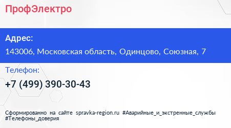 ПрофЭлектро по адресу 143006, Московская область, Одинцово, Союзная, 7 в дальнейшем Организация, размещена в следующих категориях: