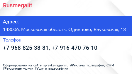 Rusmegalit по адресу 143006, Московская область, Одинцово, Внуковская, 13 в дальнейшем Организация, размещена в следующих категориях: