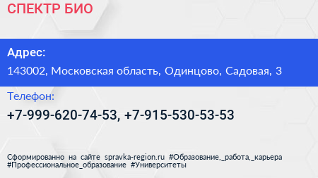 СПЕКТР-БИО по адресу 143002, Московская область, Одинцово, Садовая, 3 в дальнейшем Организация, размещена в следующих категориях: