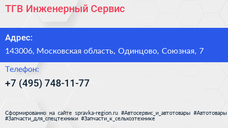 ТГВ Инженерный Сервис по адресу 143006, Московская область, Одинцово, Союзная, 7 в дальнейшем Организация, размещена в следующих категориях: