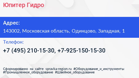 Юпитер-Гидро по адресу 143002, Московская область, Одинцово, Западная, 1 в дальнейшем Организация, размещена в следующих категориях: